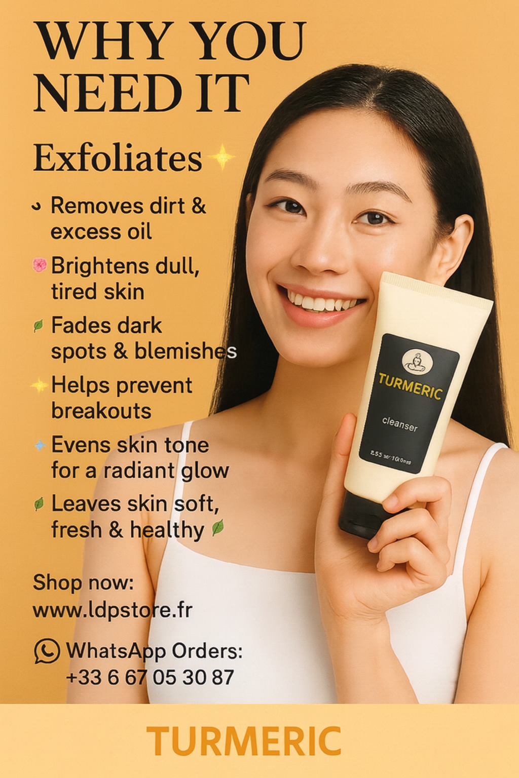 Turmeric helps minimize the appearance of dark spots, hyperpigmentation, and dullness, gradually revealing a more even, luminous complexion.