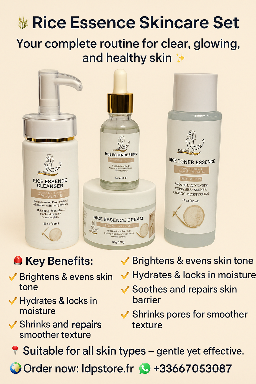 - Rice Essence Serum (30ml) – Concentrated formula that brightens dull skin, nourishes deeply, and restores natural glow.