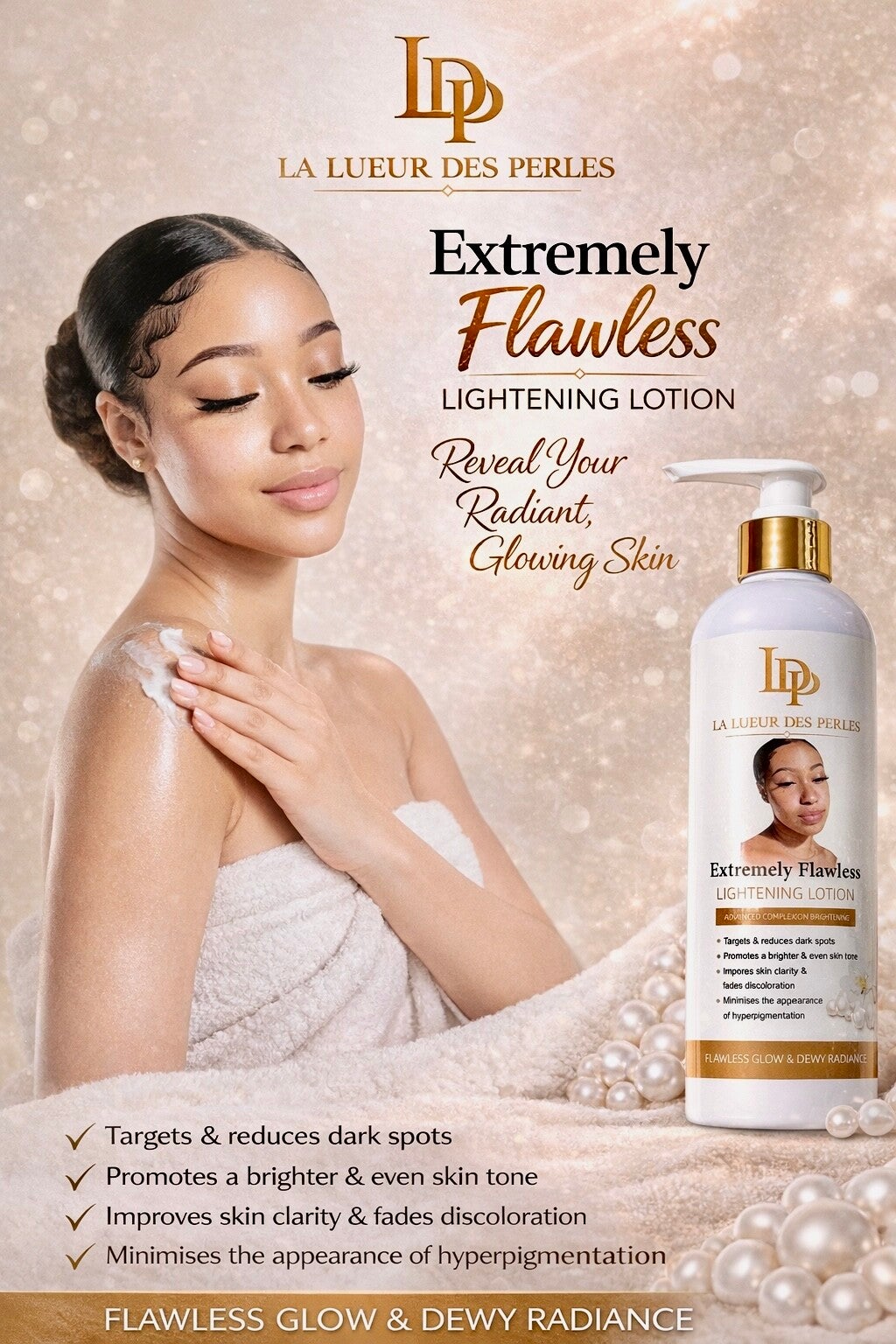 Reveal visibly brighter, smoother, and more lighter and even-toned skin with our Extremely Flawless Lightening Lotion, expertly formulated to target stubborn dark spots, uneven skin tone, and rough, dry skin.